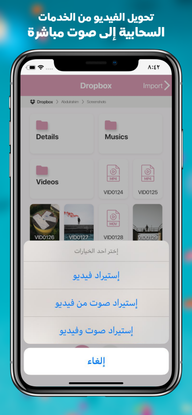 حمل برنامج تحويل الفيديو لتتمتع بالمميزات التالية: - تحويل اي فيديو الى ام بي ثري - تشغيل الفيديوهات بداخل التطبيق - تشغيل ملفات ال ام بي ثري بداخل التطبيق بعد التحويل - انشاء قوائم التشغيل - تشغيل الأغاني عندما يكون التطبيق في خلفية نظام التشغيل - امكانية تحويل الفيديو من الخدمات السحابية كلاود - امكانية استيراد ملفات الصوت من الخدمات السحابية الى التطبيق